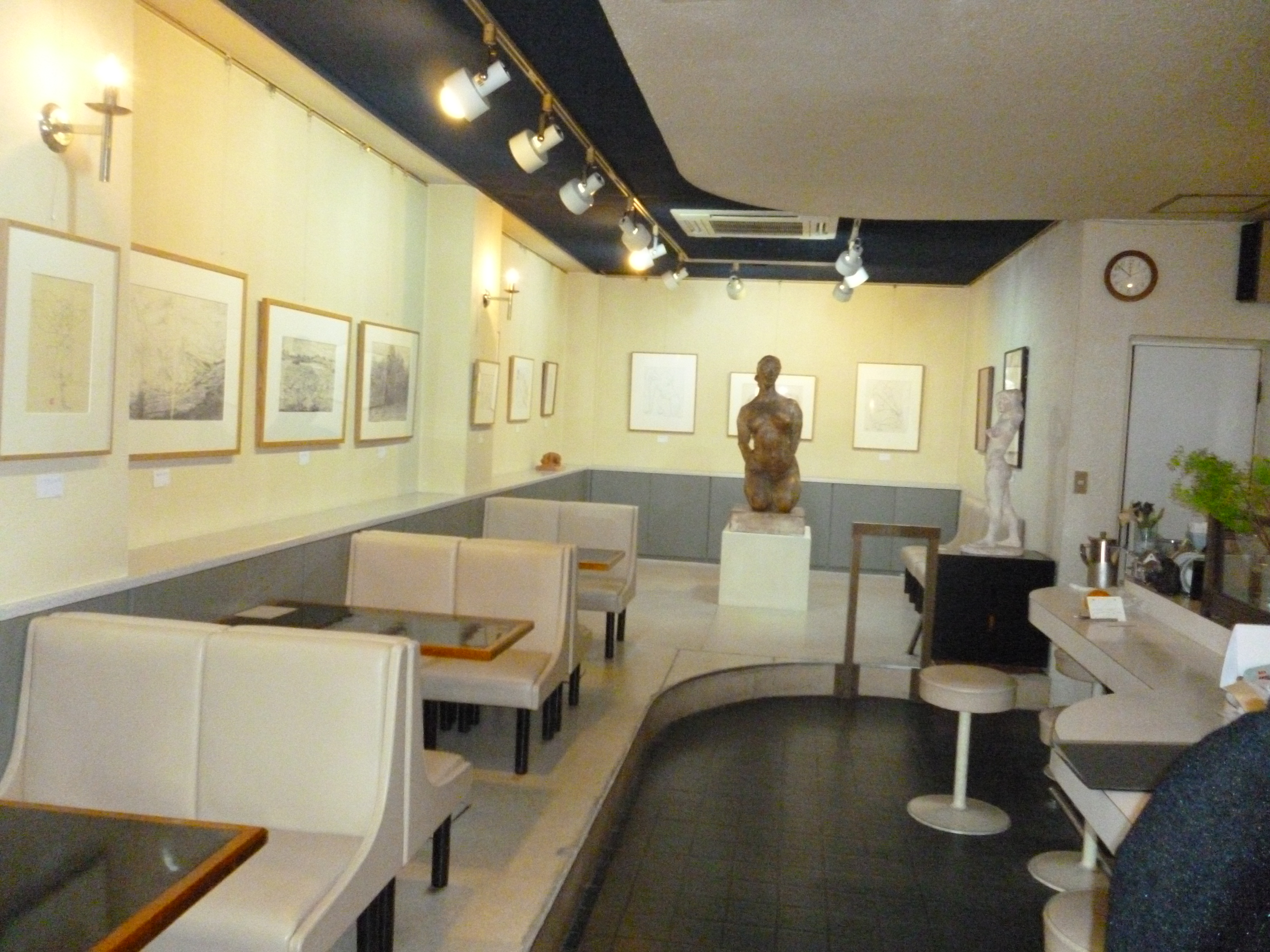 裸婦と風景の素描(鉛筆・墨)と裸婦像数点を展示しています。ギャラリー喫茶「あらき画廊」での会場の雰囲気と風景をご覧ください。
